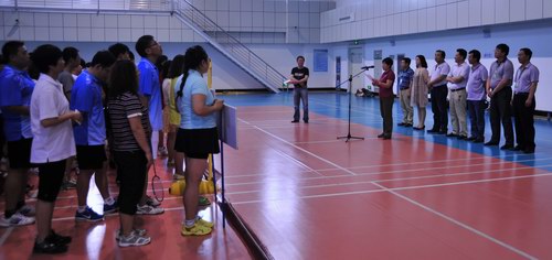 为进一步丰富我校广大教职员工的业余文化生活,激发健身意识,以良好的精神面貌投身到学校建设和发展的各项工作中来,6月16日下午3:00,由我校工会主办的2014年铁岭师专教职工羽毛球比赛开幕式暨羽毛球协会成立仪式在我校体育馆举行。党委书记、校长徐兆东,党委副书记王智勇,党委委员、副校长伊宏伟,副校长刘辉,党委委员、副校长杜振方,党委委员、副校长蔡田,党委委员、纪委书记赵凯,党委委员、工会主席曹丽萍出席了开幕式。各个参赛代表队的中层领导和队员也参加了开幕式。