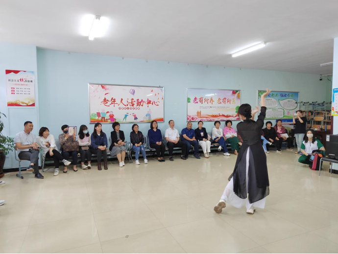 座谈会后,管理学院的相关专业教师为社区的老年人提供了心理咨询和法律咨询等服务。社区管理与服务专业的同学在老年人活动中心,与社区的老年人开展了别开生面的文艺活动,学生们表演了独唱《贝加尔湖畔》《青花瓷》和舞蹈《江南》,社区的老年朋友也表演了《万疆》《九九艳阳天》等节目,现场气氛其乐融融。